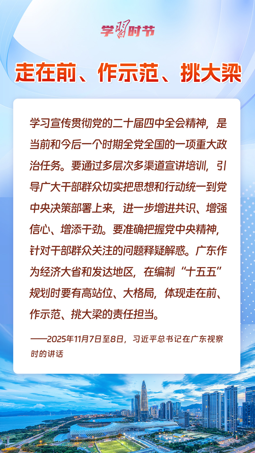 11月6日至10日,习近平总书记在党的二十届四中全会胜利闭幕后不久亲临广东视察、出席第十五届全国运动会开幕式,发表重要讲话、作出重要指示,着眼“两个大局”为广东发展定向导航,为广东谋划“十五五”发展、推进现代化建设指明前进方向、注入强大动力。