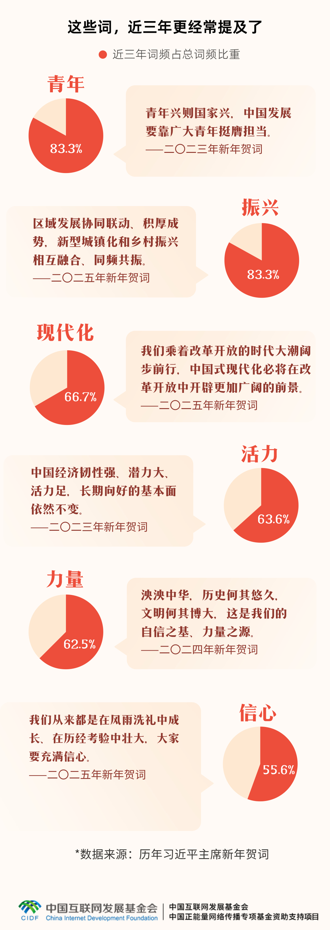 通过分析党的二十大以来的新年贺词,可以看到近三年来,习近平主席在新年贺词中特别强调了“青年”“振兴”“现代化”“活力”“力量”和“信心”等关键词。