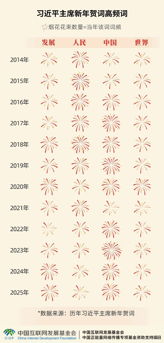 从高频词分析结果来看,“发展”“人民”“中国”“世界”是他每年新年贺词都会强调的词语。