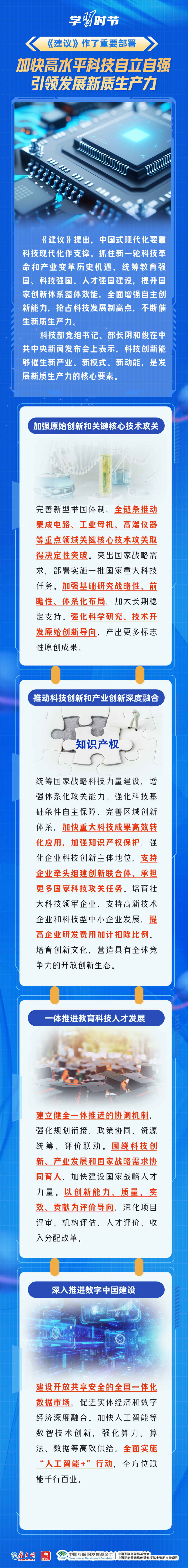 《建议》在提出“科技自立自强水平大幅提高”总目标的基础上,又明确“提升国家创新体系整体效能,全面增强自主创新能力,抢占科技发展制高点,不断催生新质生产力”等具体目标,并制定“加强原始创新和关键核心技术攻关”“推动科技创新和产业创新深度融合”等四条发展新举措。由此,可以清晰感知我国加快高水平科技自立自强的方式和路径。