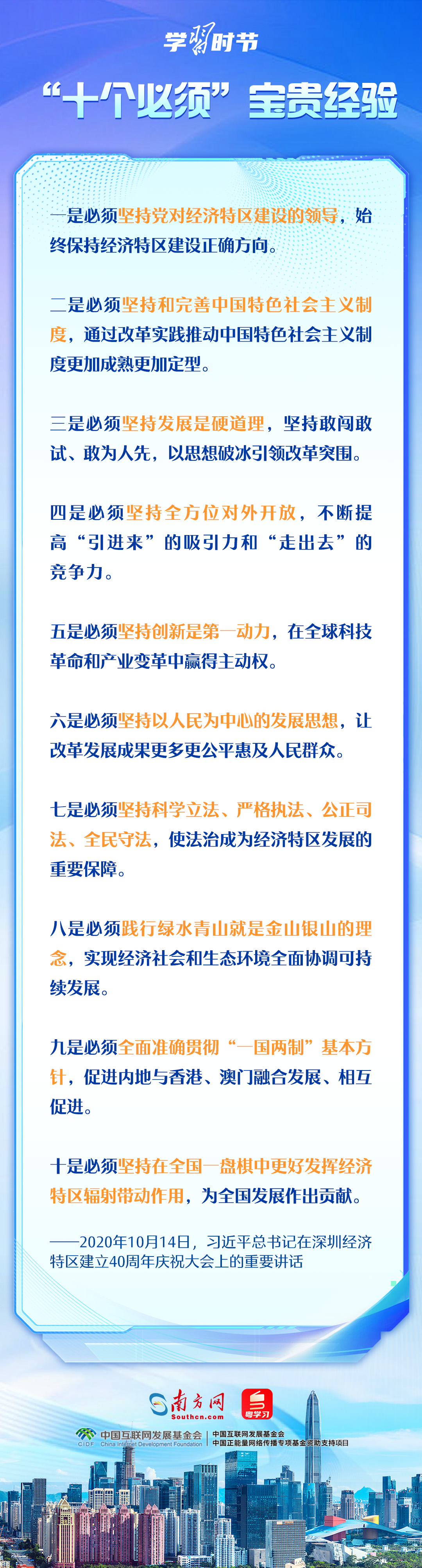 深圳等经济特区一路走来,每一步都不是轻而易举的,每一步都付出了艰辛努力。2020年10月14日,在深圳经济特区建立40周年庆祝大会上,习近平总书记指出,深圳等经济特区40年改革开放实践,创造了伟大奇迹,积累了宝贵经验,深化了我们对中国特色社会主义经济特区建设规律的认识。他概括提出了“十个必须”的宝贵经验: