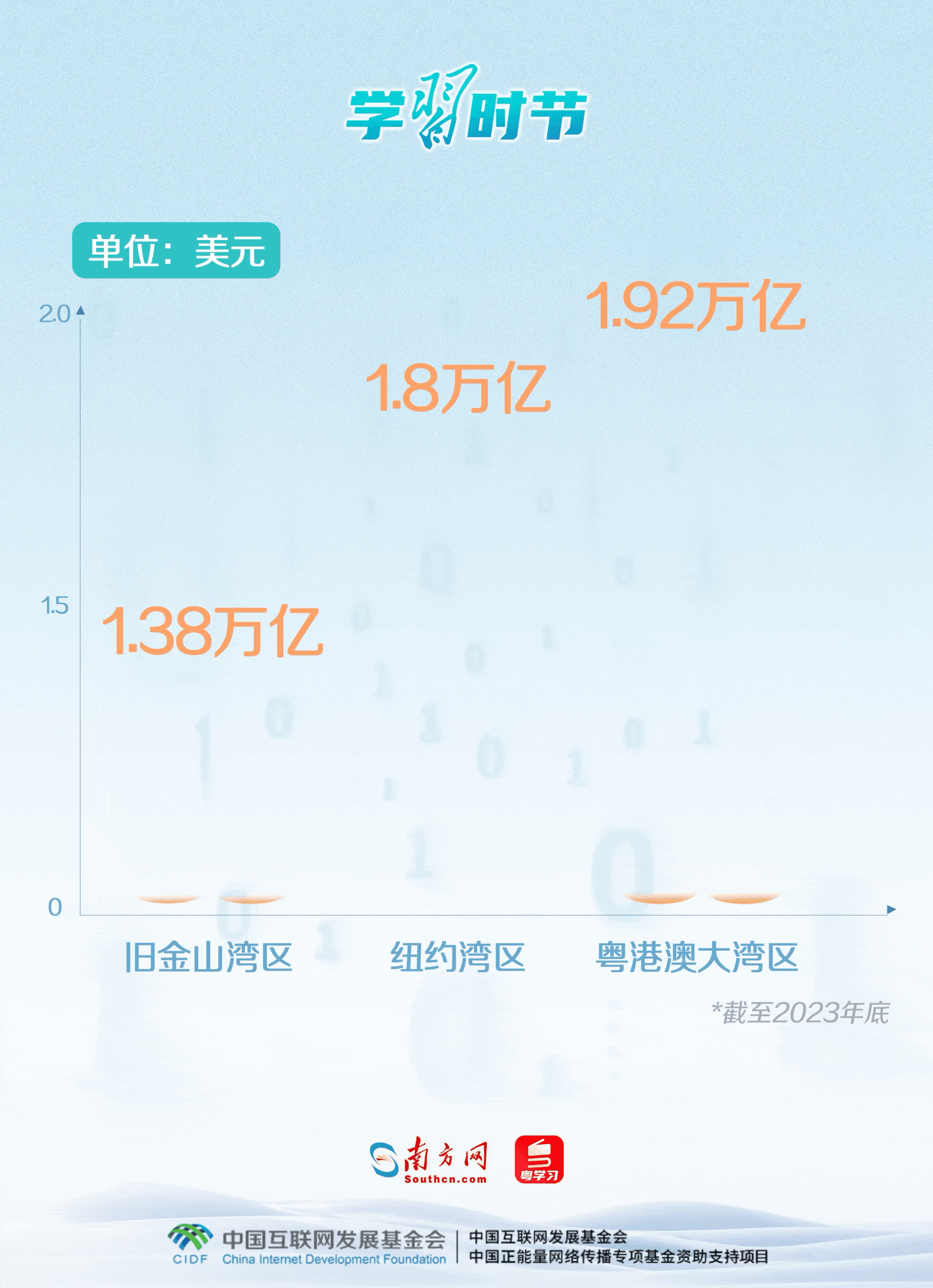 截至2023年底,大湾区经济总量突破14万亿元人民币(约合1.92万亿美元),成为中国经济最具竞争力和最具活力的区域之一,入列全球湾区第一梯队;