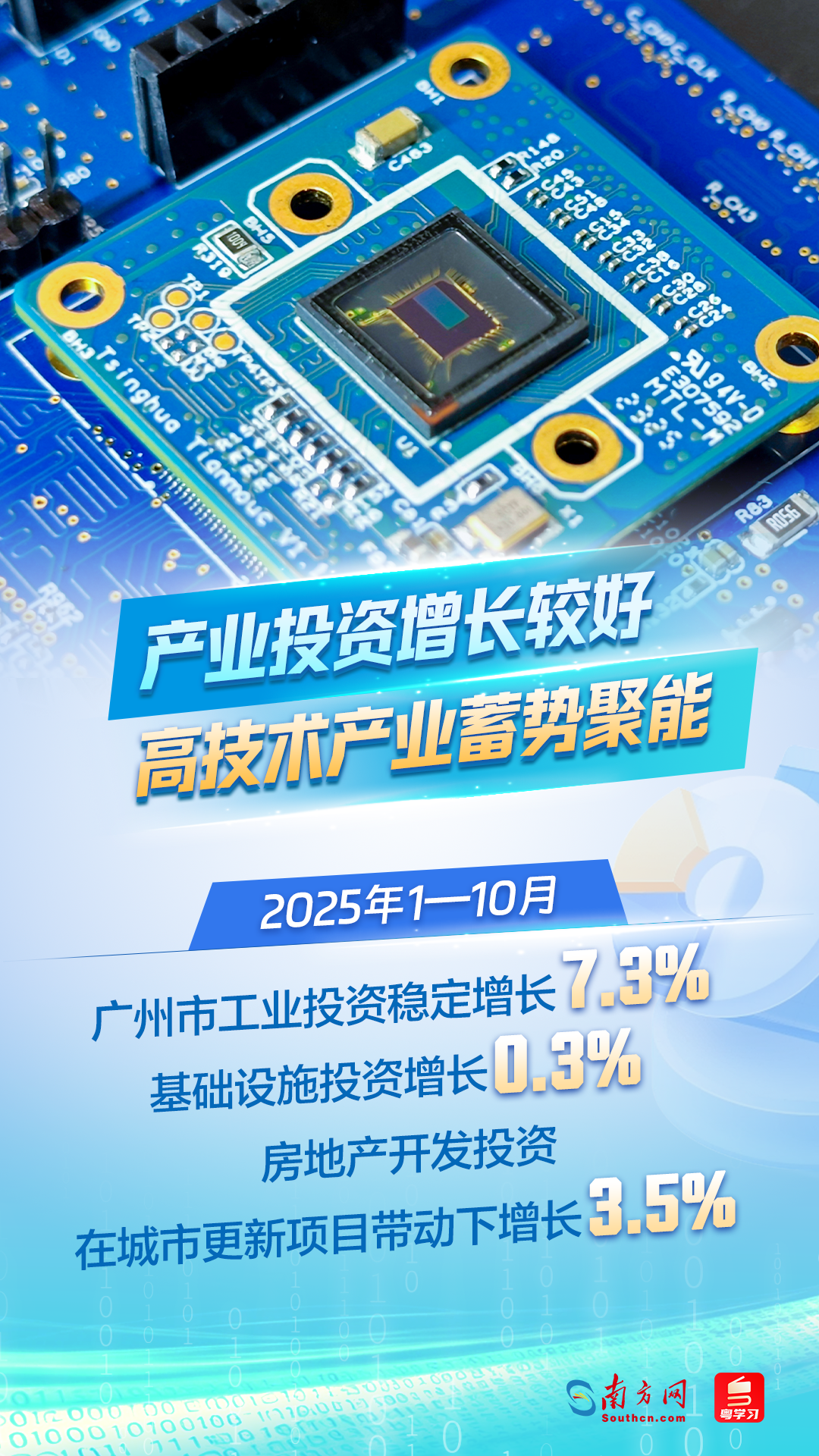 1—10月,广州市完成固定资产投资同比下降0.9%。分领域看,工业投资稳定增长7.3%,基础设施投资增长0.3%,房地产开发投资在城市更新项目带动下增长3.5%。其中,高技术产业蓄势聚能,医疗仪器设备及仪器仪表制造业、航空航天器及设备制造业完成投资分别增长25.0%和66.4%;高技术服务业中的信息服务、研发设计服务投资分别增长23.1%和38.5%。