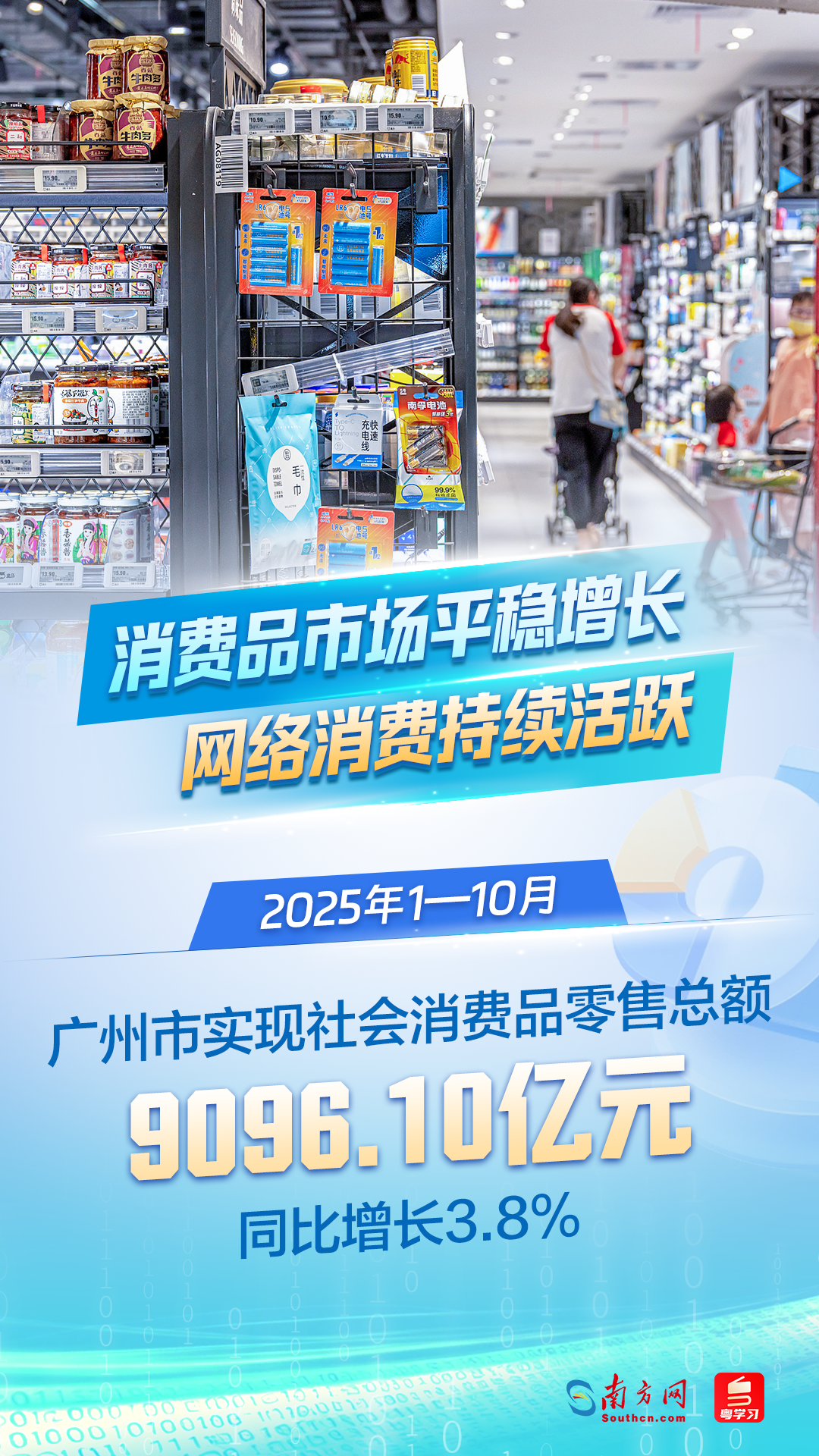1—10月,广州市实现社会消费品零售总额9096.10亿元,同比增长3.8%。线上消费增势向好,限额以上批发零售业实物商品网上零售额、住宿餐饮企业通过公共网络实现餐费收入分别增长10.2%和15.5%。