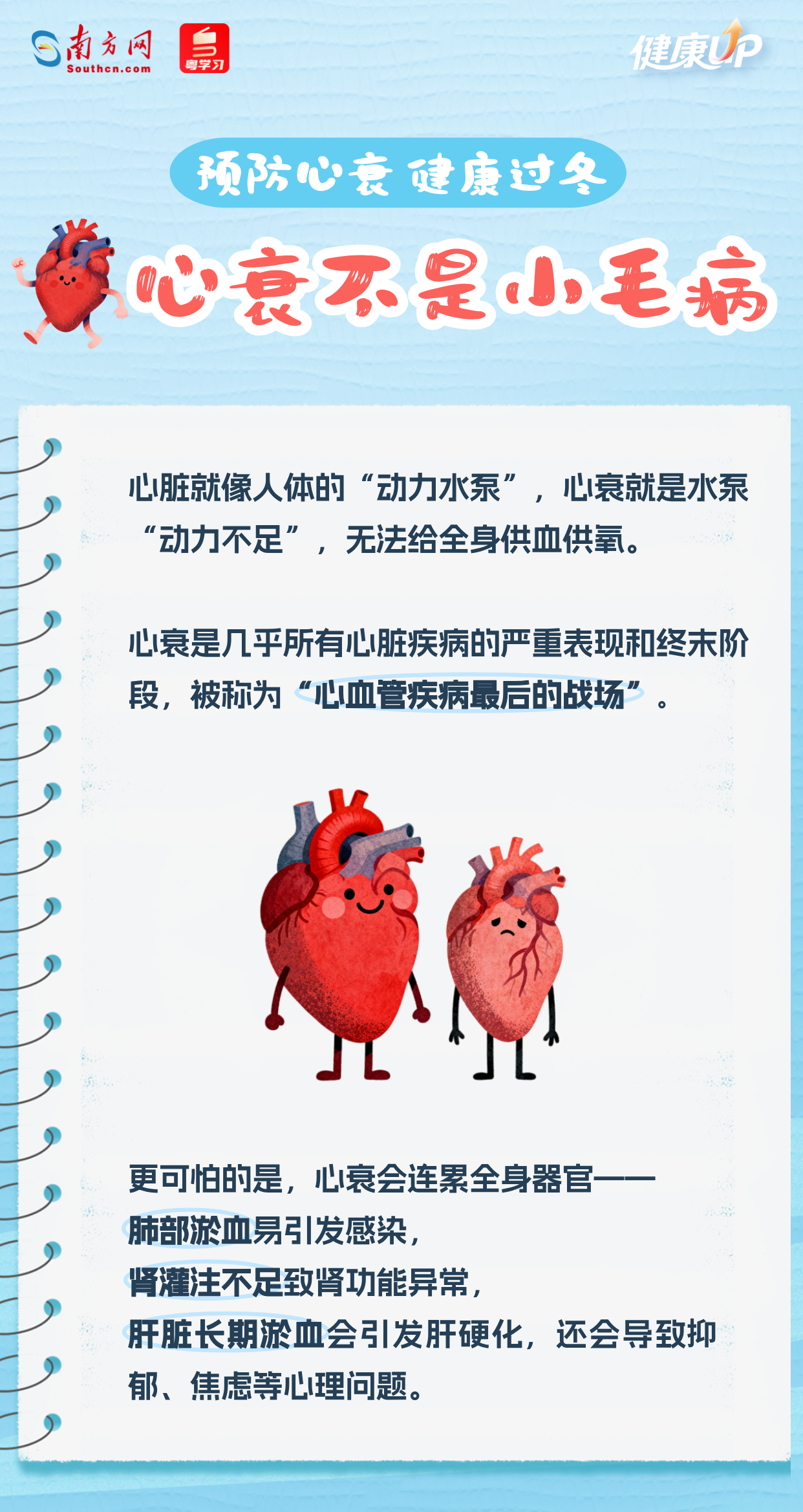 11月26日是全国心力衰竭日。心力衰竭(简称“心衰”)是各种心脏疾病进展至严重阶段而引起的一种复杂的临床综合征,有很高的病死率。冬季血管收缩、血压升高,正是心衰的高发期。