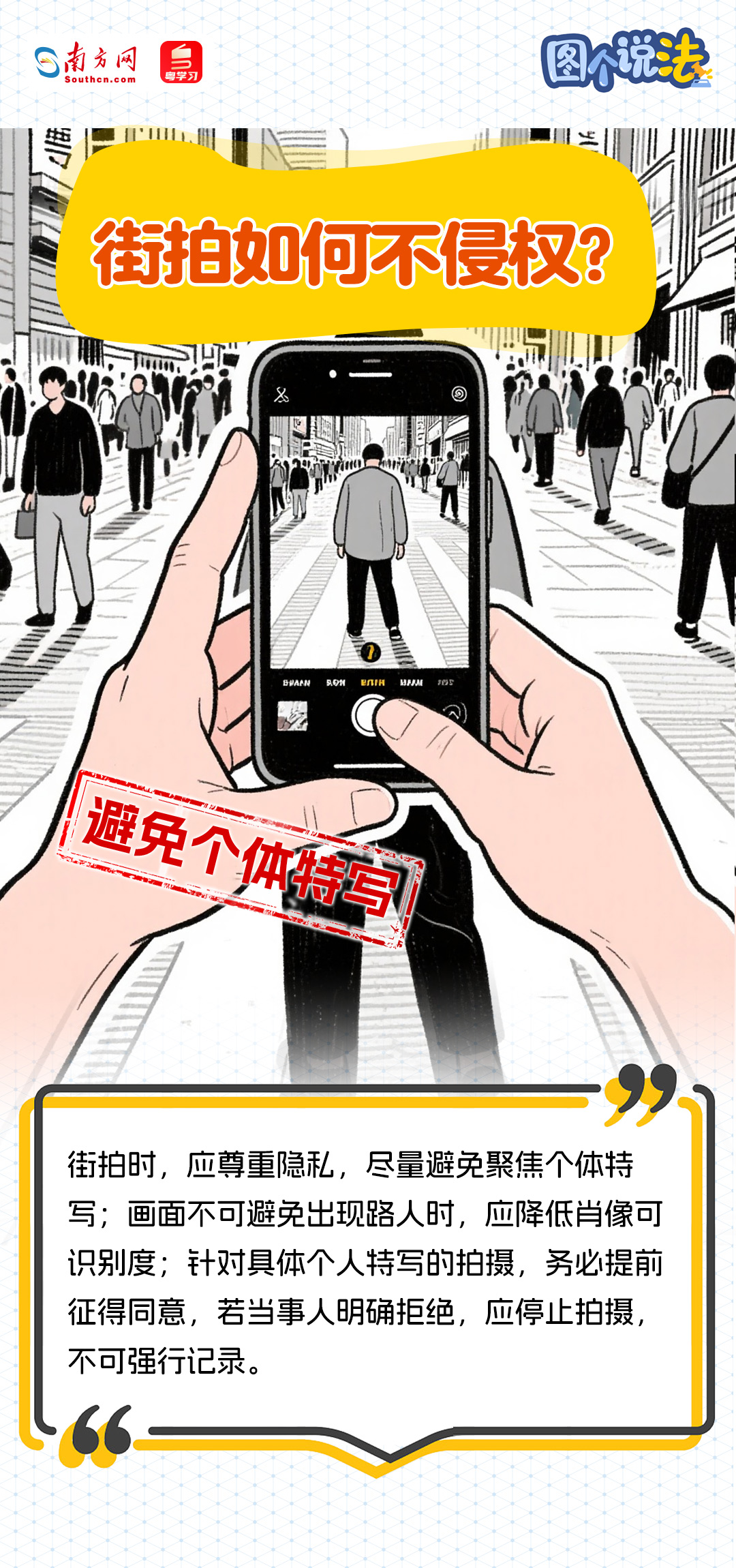 街拍时,如何既分享美好,又避免肖像权纠纷?廖建勋建议,在街拍时,应尽量避免聚焦个体特写,尊重所有人的隐私;画面不可避免出现路人时,应降低肖像可识别度,避免对当事人面部进行特写;针对具体个人特写的拍摄,务必提前征得同意,若当事人明确拒绝,应停止拍摄,不可强行记录。