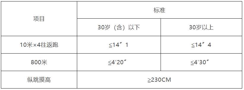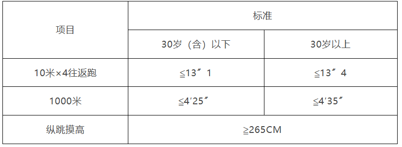 体能测评包括三个项目,分别为纵跳摸高、10米×4往返跑、1000米跑,其中10米×4往返跑测试次数不超过2次、1000米(男)/800米(女)跑测试次数不超过1次,纵跳摸高测试次数不超过2次。体能测评采用达标制,任意一项不达标的,即为体能测评不合格,不进入下一环节。体能测评不设缓测、补测,达标标准详见下表。