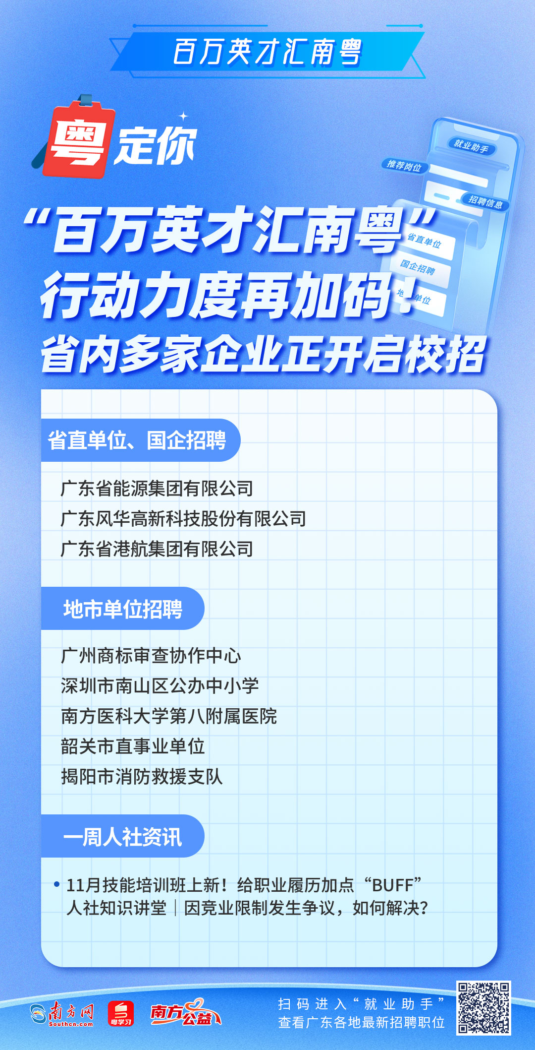 其它招聘资讯方面,广东省能源集团有限公司、广东风华高新科技股份有限公司、广东省港航集团有限公司等国企正在开启校招,多个岗位面向应届毕业生开放。还有广州、深圳、佛山、韶关、揭阳等地提供多个工作岗位。部分岗位招聘时间即将截止,赶快抓紧时间投递简历吧!